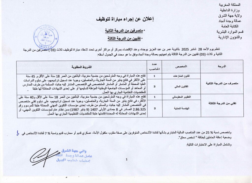 La Préfecture Oujda Angad organise un concours pour le recrutement de 06 postes répartis comme suit: