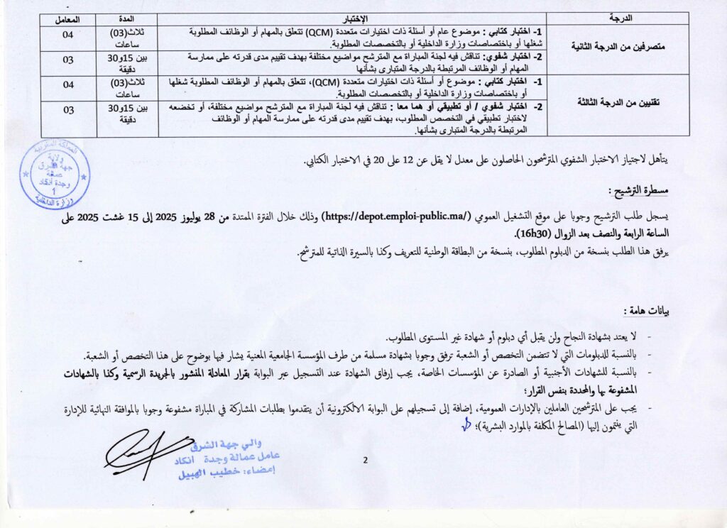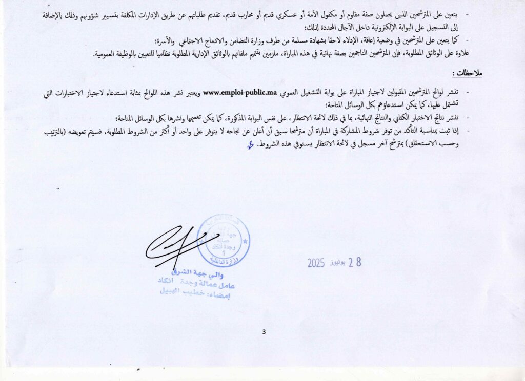 * مسطرة الترشيح: يتم تسجيل طلب الترشيح وجوباً على الموقع الإلكتروني depot.emploi-public.ma خلال الفترة المحددة.