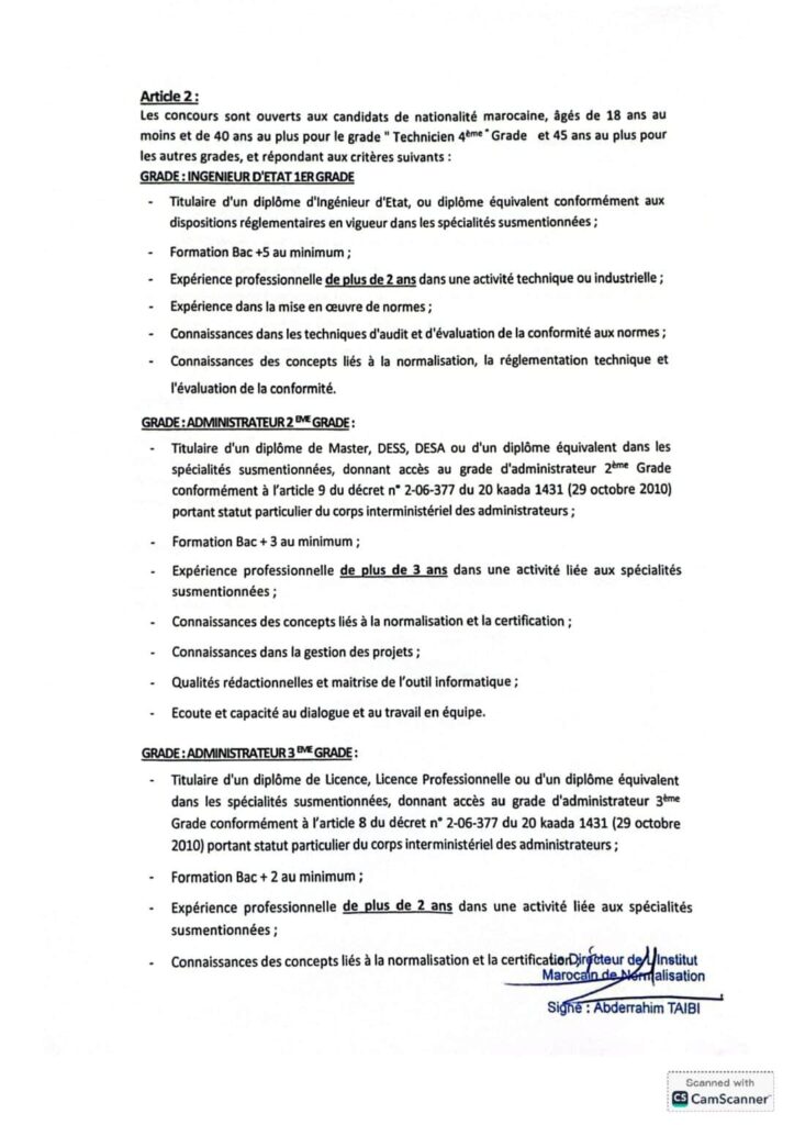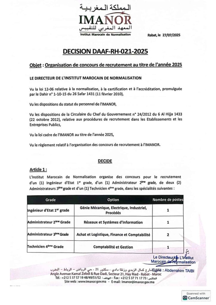 L’institut Marocain de Normalisation IMANOR organise un concours pour le recrutement de 5 postes répartis comme suit: