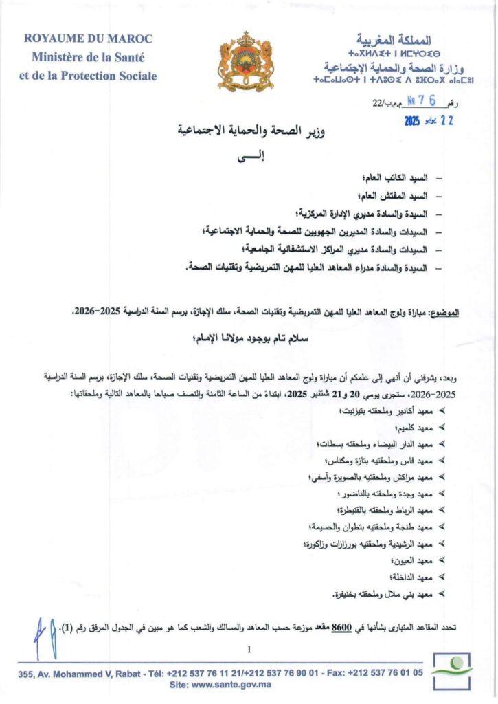 تنظم وزارة الصحة والحماية الاجتماعية مباراة وطنية هامة لولوج المعاهد العليا للمهن التمريضية وتقنيات الصحة – سلك الإجازة برسم السنة الجامعية 2025-2026، وذلك يومي 20 و21 شتنبر 2025 ابتداءً من الساعة الثامنة والنصف صباحًا، وتفتح هذه الفرصة أمام جميع الحاصلين على شهادة البكالوريا الراغبين في بناء مسار مهني واعد في قطاع الصحة، مع تخصيص 8600 مقعد موزعة على مختلف المعاهد والمسالك والشعب المعتمدة.